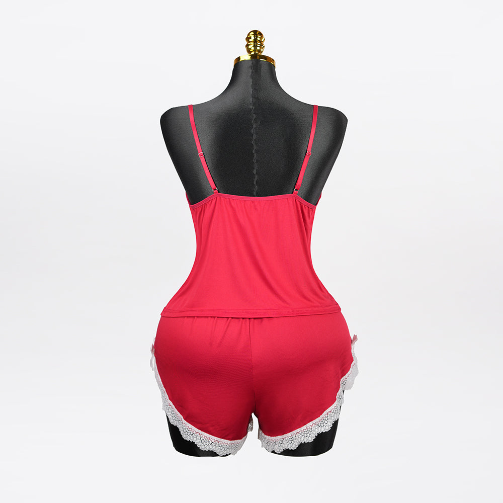 Red plus size pajama set. Elegant white lace trims the soft fabric, creating a flattering and cozy silhouette designed for confident relaxation.