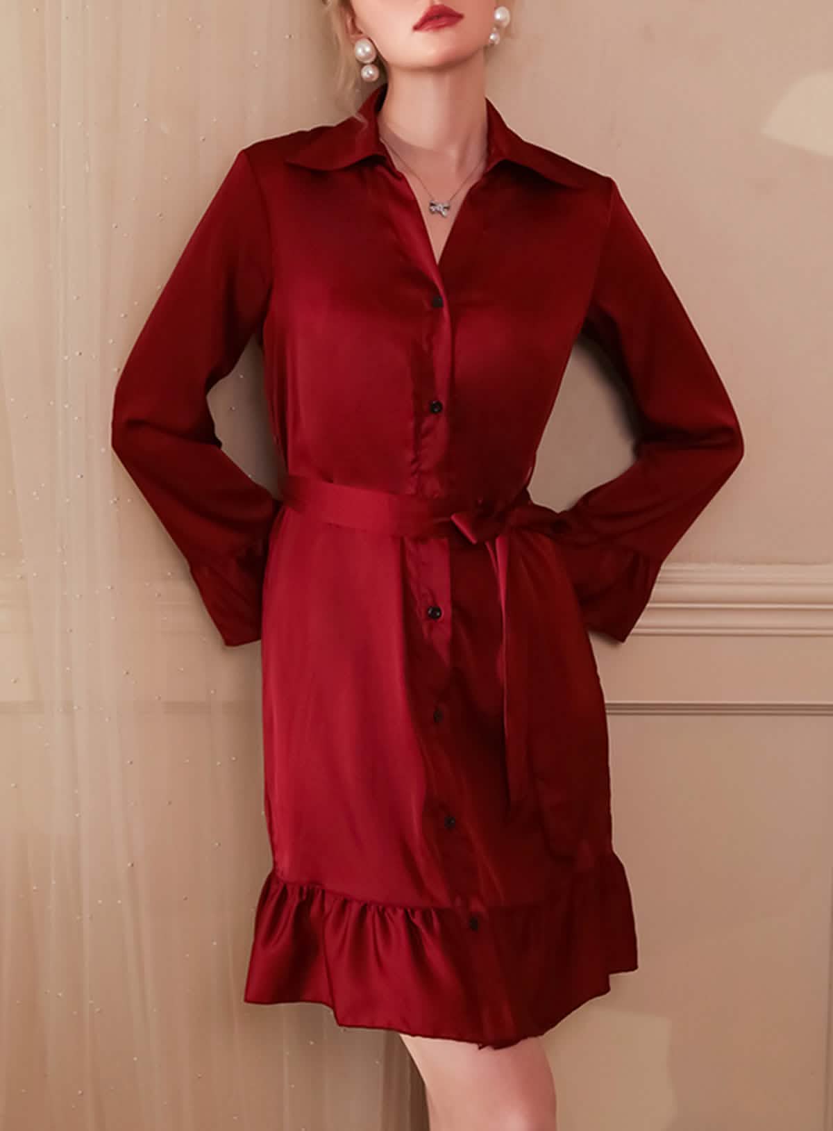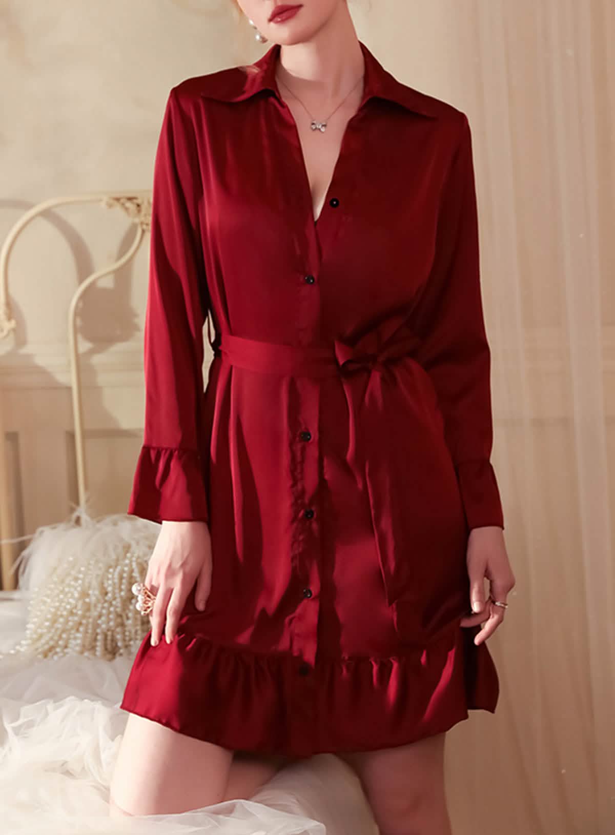 يوصى بالغسيل اليدوي: اغسله برفق في ماء بارد باستخدام منظف خفيف للحفاظ على ملمس الساتان الناعم وتفاصيل الكشكشة الدقيقة.