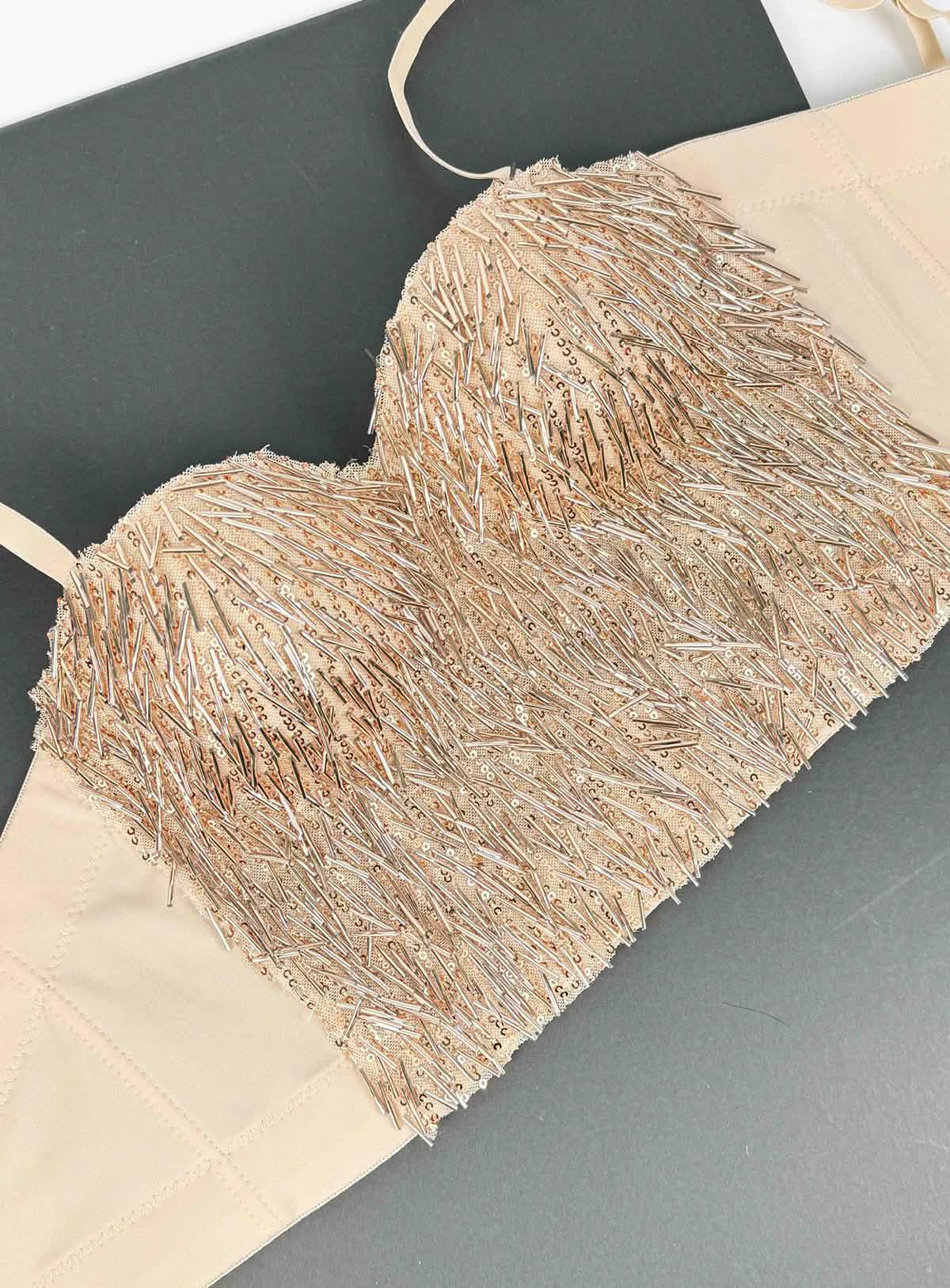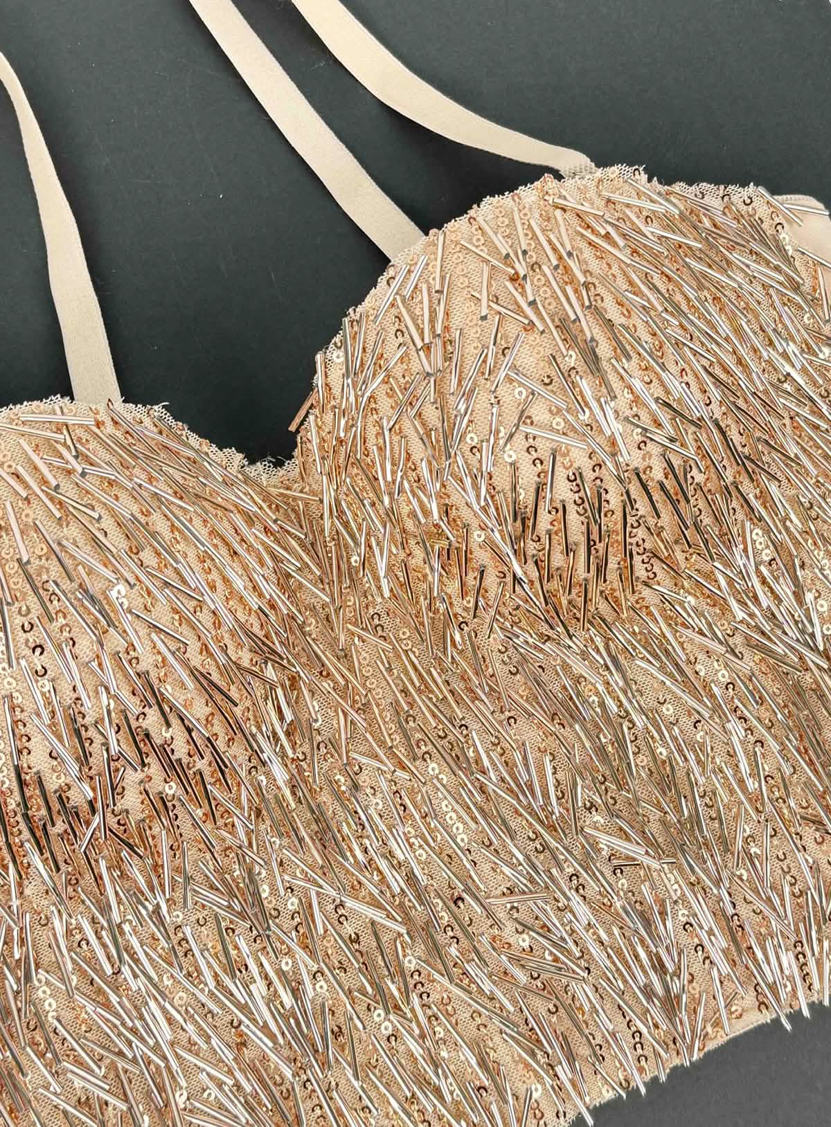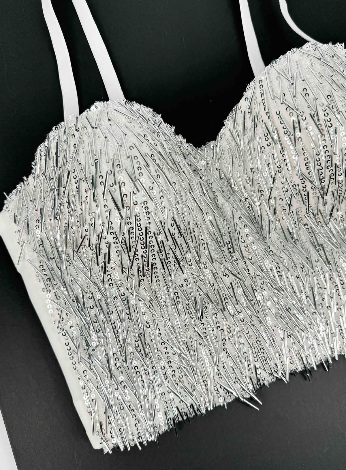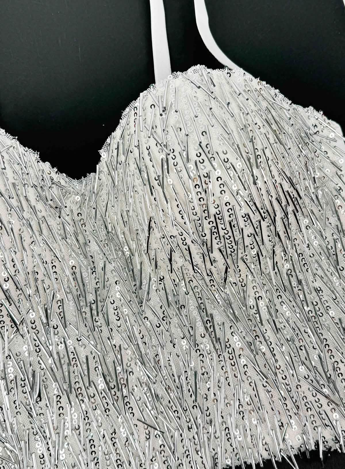 Intricate Sequin and Bead Overlay: Densely arranged sequins and elongated beads create a sculptural, light-catching surface.