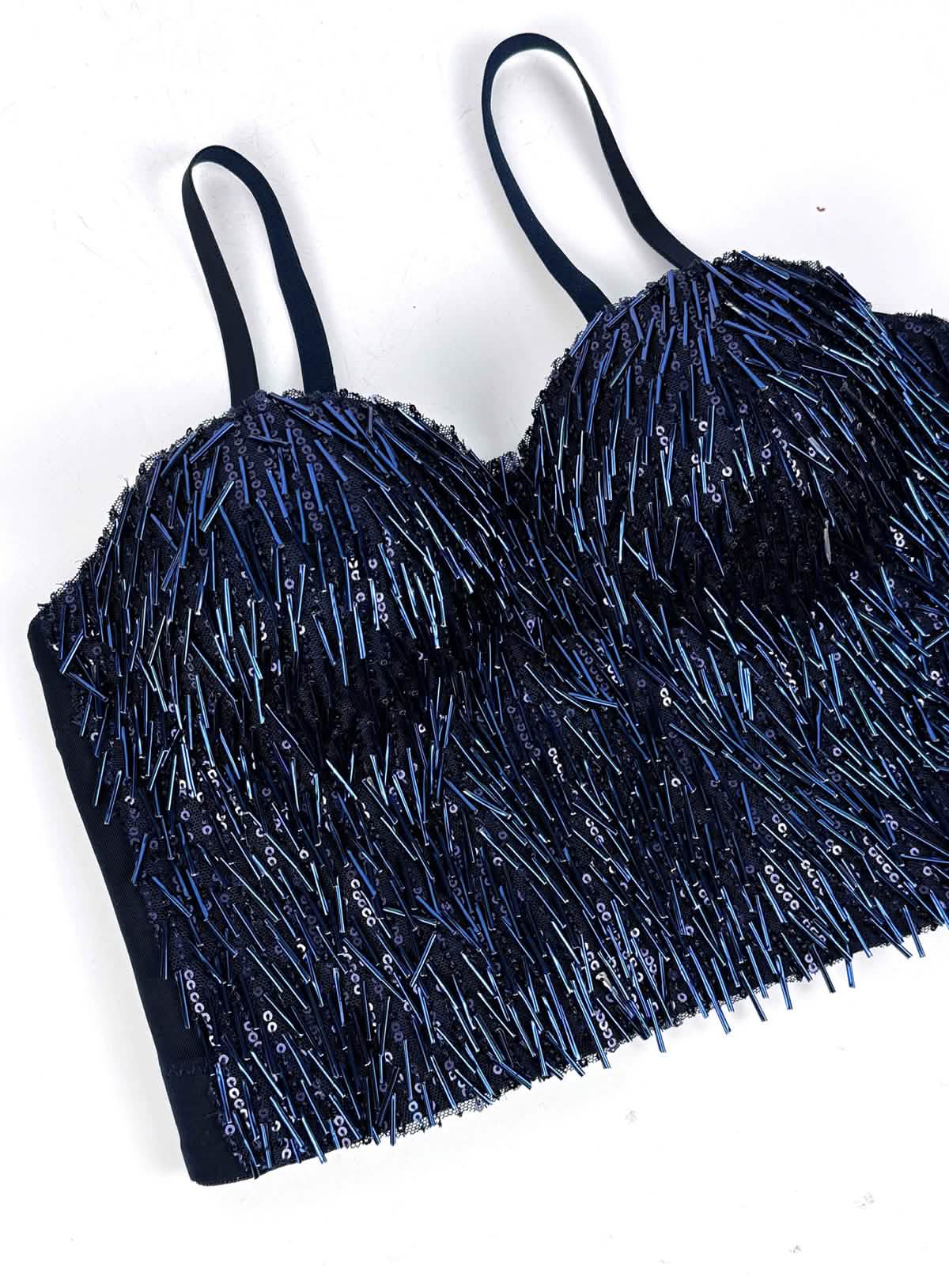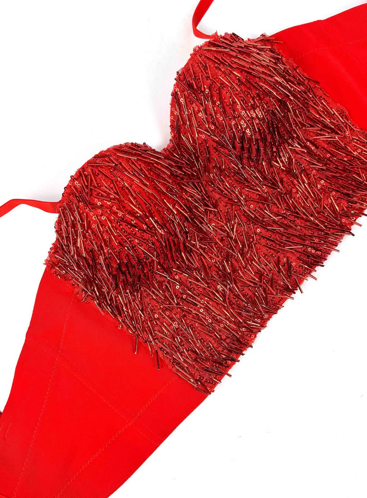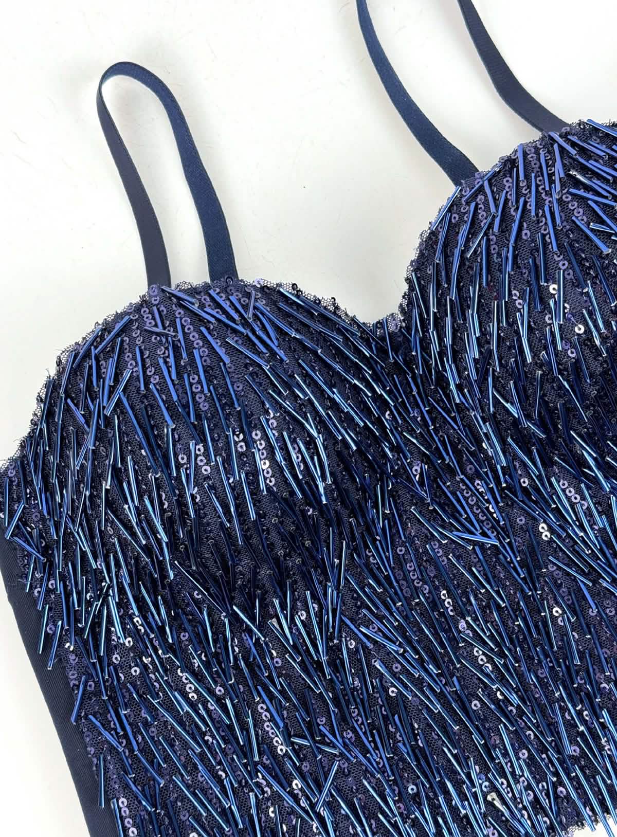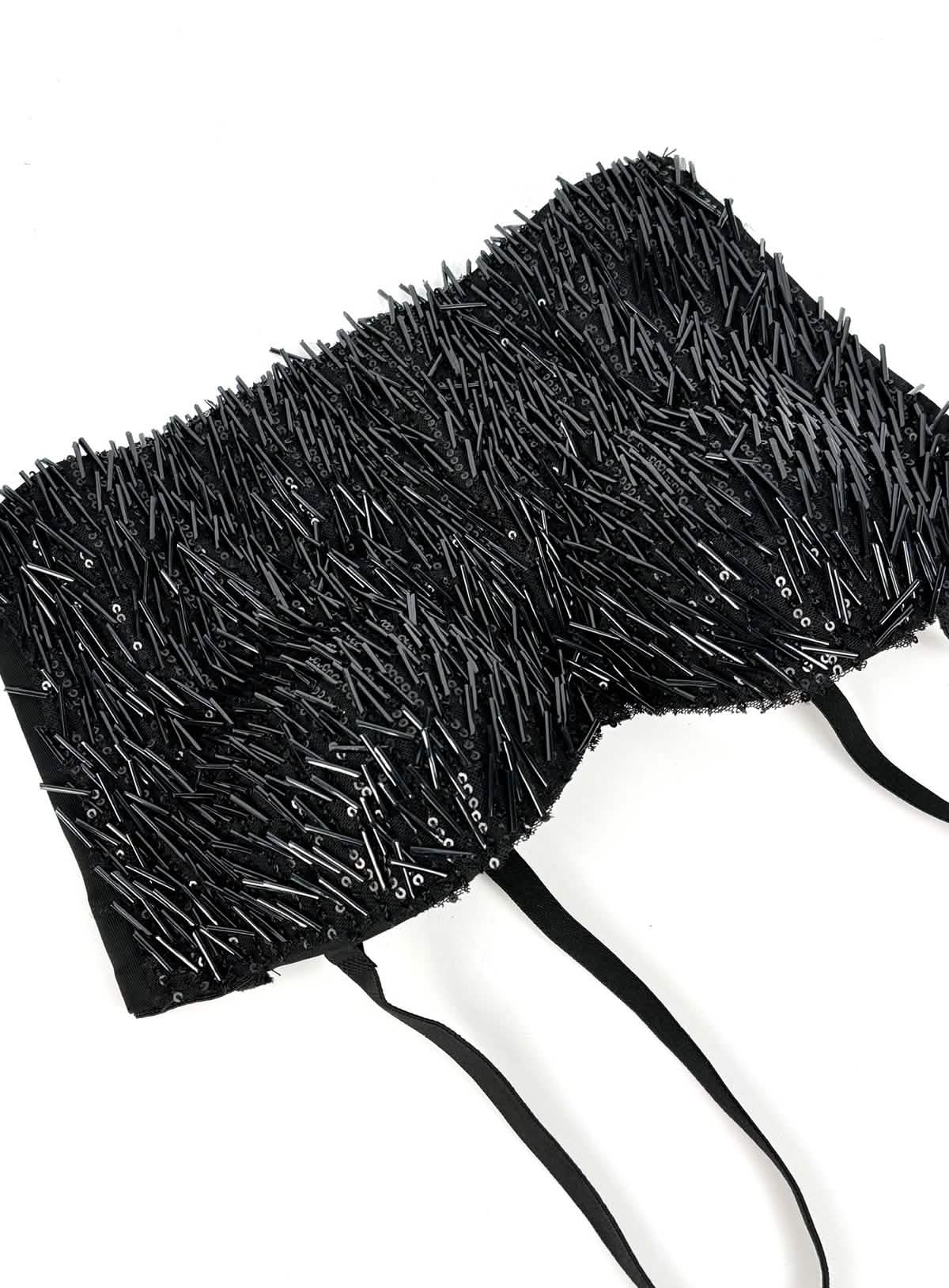 Intricate Sequin and Bead Overlay: Densely arranged sequins and elongated beads create a sculptural, light-catching surface.
