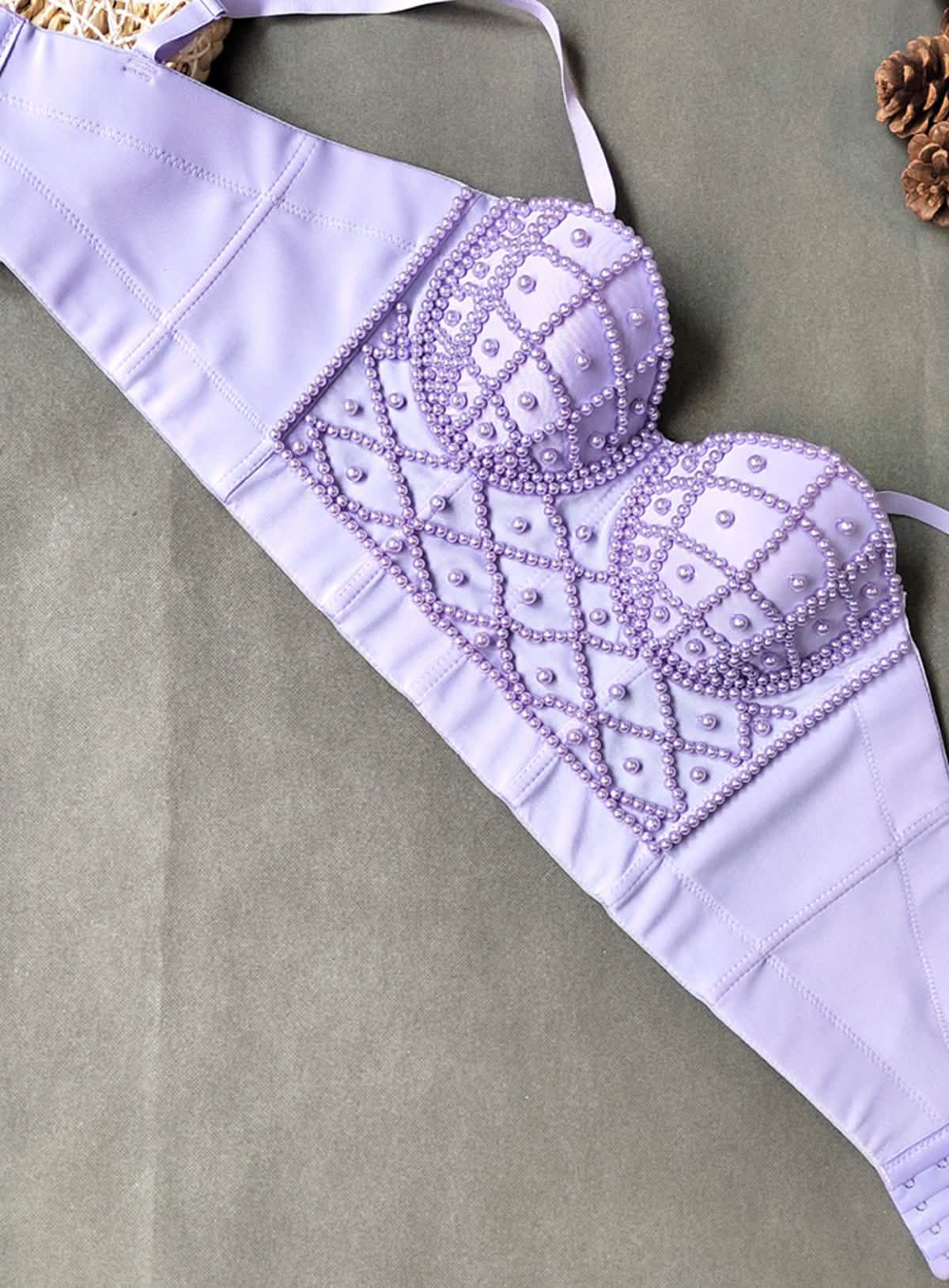 Three-Dimensional Pearl Overlay: A mix of pearl sizes arranged in a geometric pattern for a sculptural, light-reflecting effect.