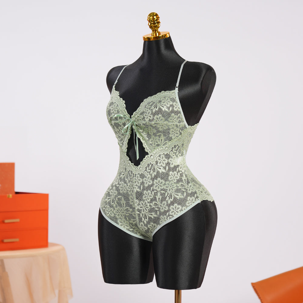 Light Green Lace Bodysuit. Featuring Delicate Thin Straps, a Charming Chest Bow, and a Pearl Choker for a Vintage Romantic Look.