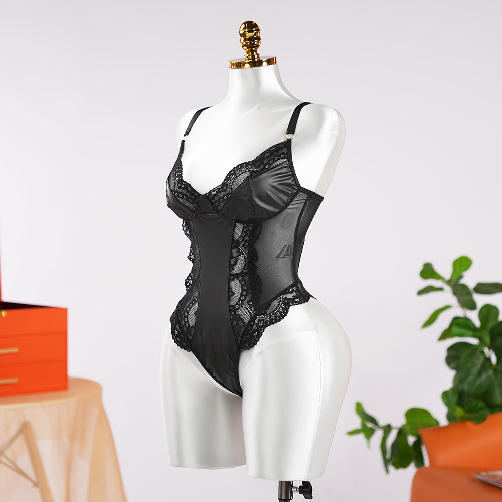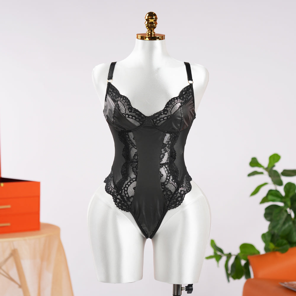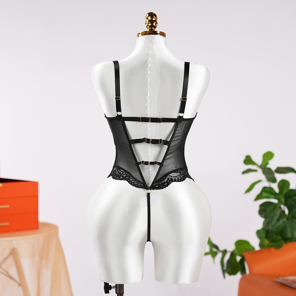 Black Temptation Sexy Tight Bodysuit. The classic black color, paired with delicate lace patterns, creates a mysterious and sexy ambiance. The sheer lace design adds a hazy beauty.