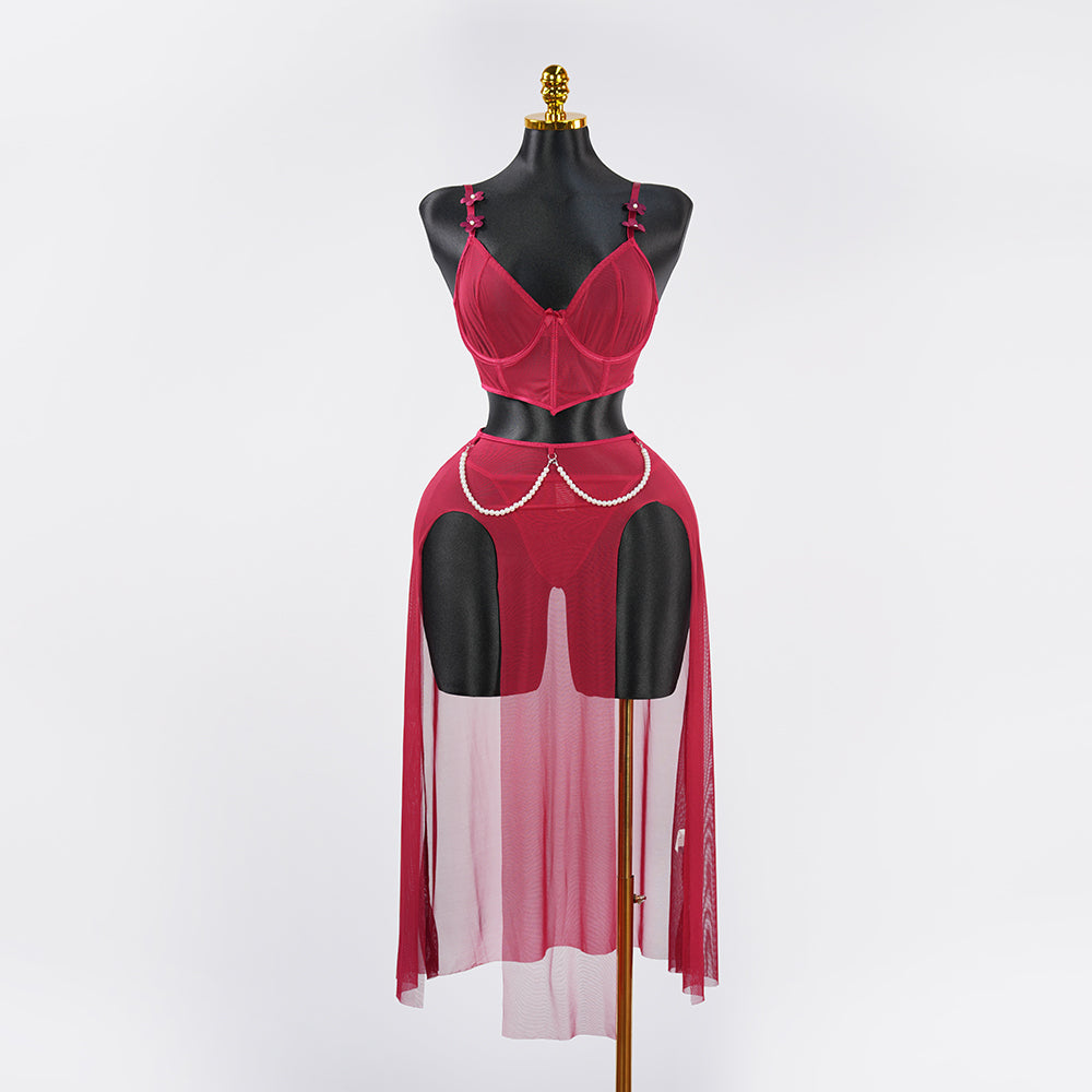 Structured bra top paired with a high-slit sheer skirt and matching panty, accented by a pearl waist chain—bold, elegant, and irresistibly sexy.