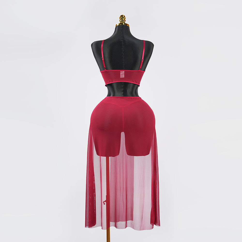 Red Sheer Mesh Lingerie Bra Panty Dress Set