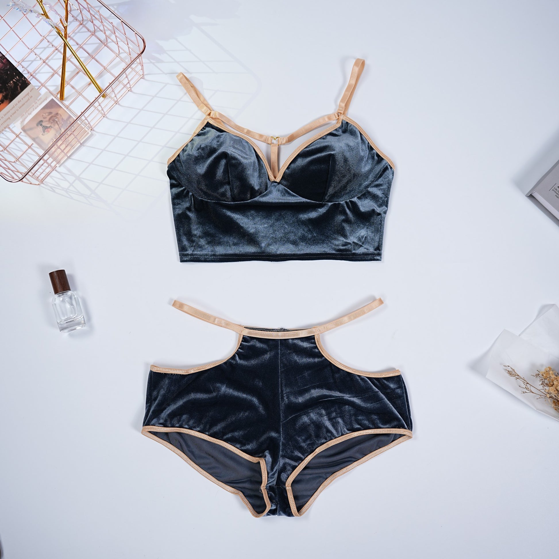 Velvet Grayish Blue Luxury Bra & Panty Sets, Soft, plush velvet offers warmth and opulence, ideal for cozy elegance. Metallic trim elevates visual appeal, contrasting with deep blue velvet for a glamorous touch.