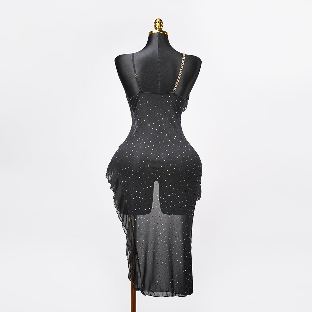 Delicate sheer mesh fabric adorned with subtle glitter details, metallic straps add a touch of personality.