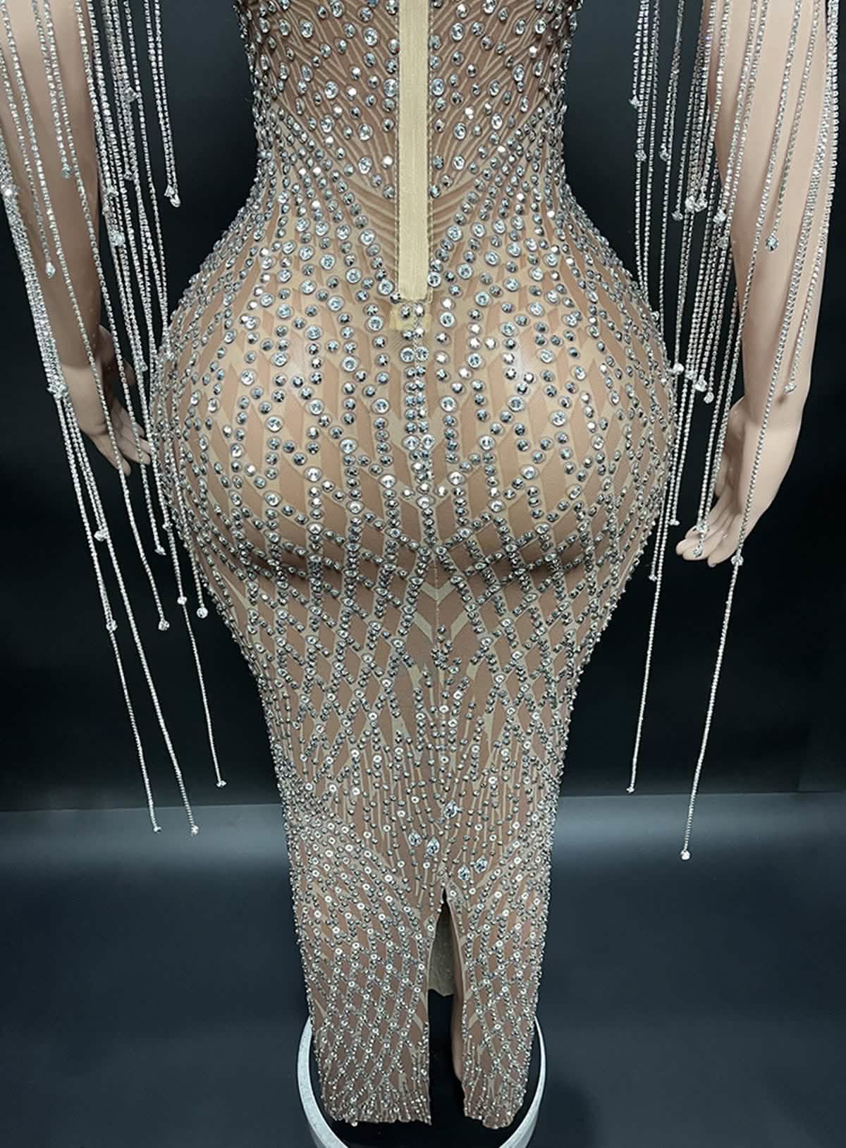 Cascading Fringe Sleeves: Delicate crystal fringe drapes from the sleeves, adding dramatic movement.