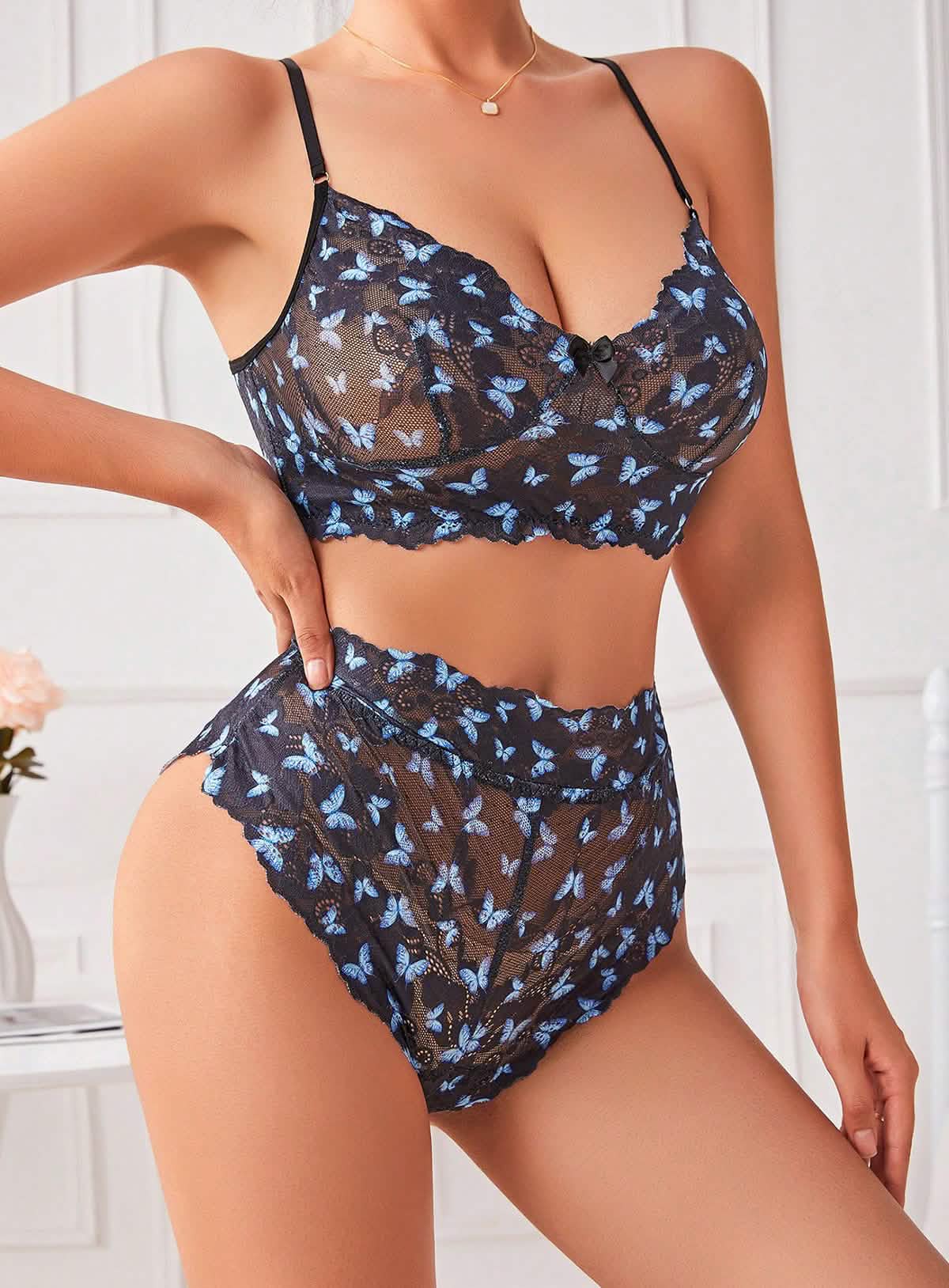 Title: Butterfly Rhapsody Black Lace Lingerie Set �Featuring Blue Butterfly Patterns, Off-Shoulder Styling, and a Central Bow for a Contemporary, Romantic Look