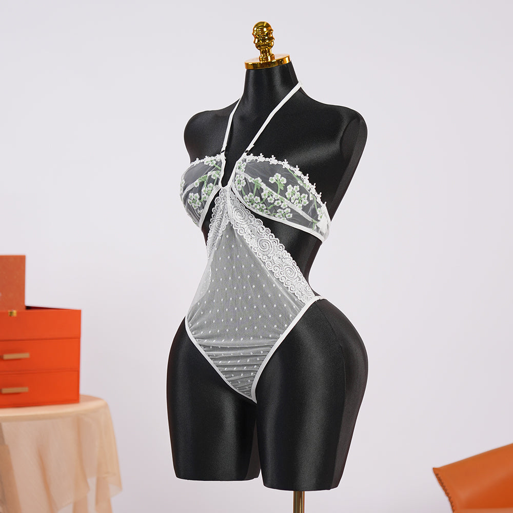 White lace embroidery bodysuit, design features delicate straps combined with a seductive deep V-neck that elegantly sculpts the shoulders, collarbones, and bust, exuding both confidence and allure. Intricate lace embellishments blend seamlessly with contemporary custom-fit aesthetics, offering a luxurious yet romantically edgy appeal.