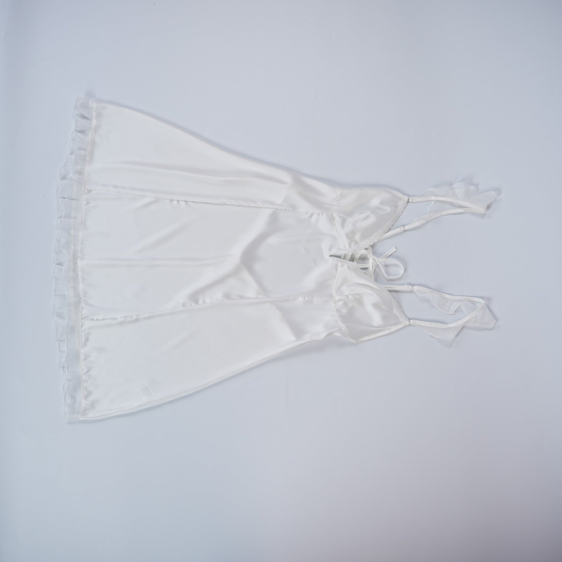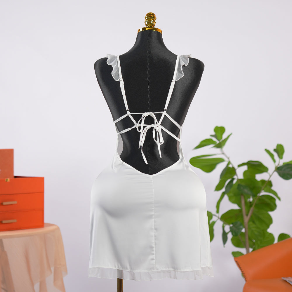 Features a pristine white tone and is crafted with premium satin fabric, delivering a smooth and flowing texture. Delicate lace details adorn the neckline and sleeve edges, adding a subtle touch of sensuality.