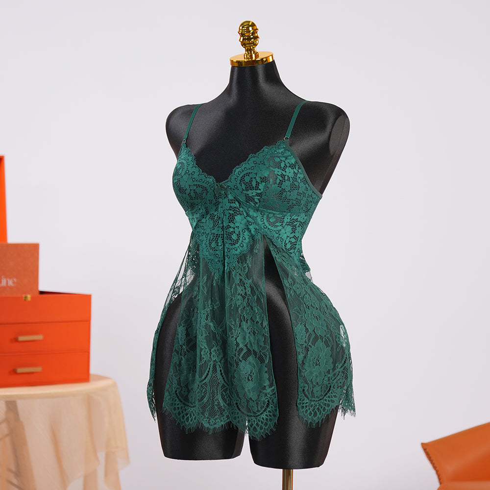 Green lace set, including a suspender top and panties. There are buckle adjusters on the back, which can flatter the figure.