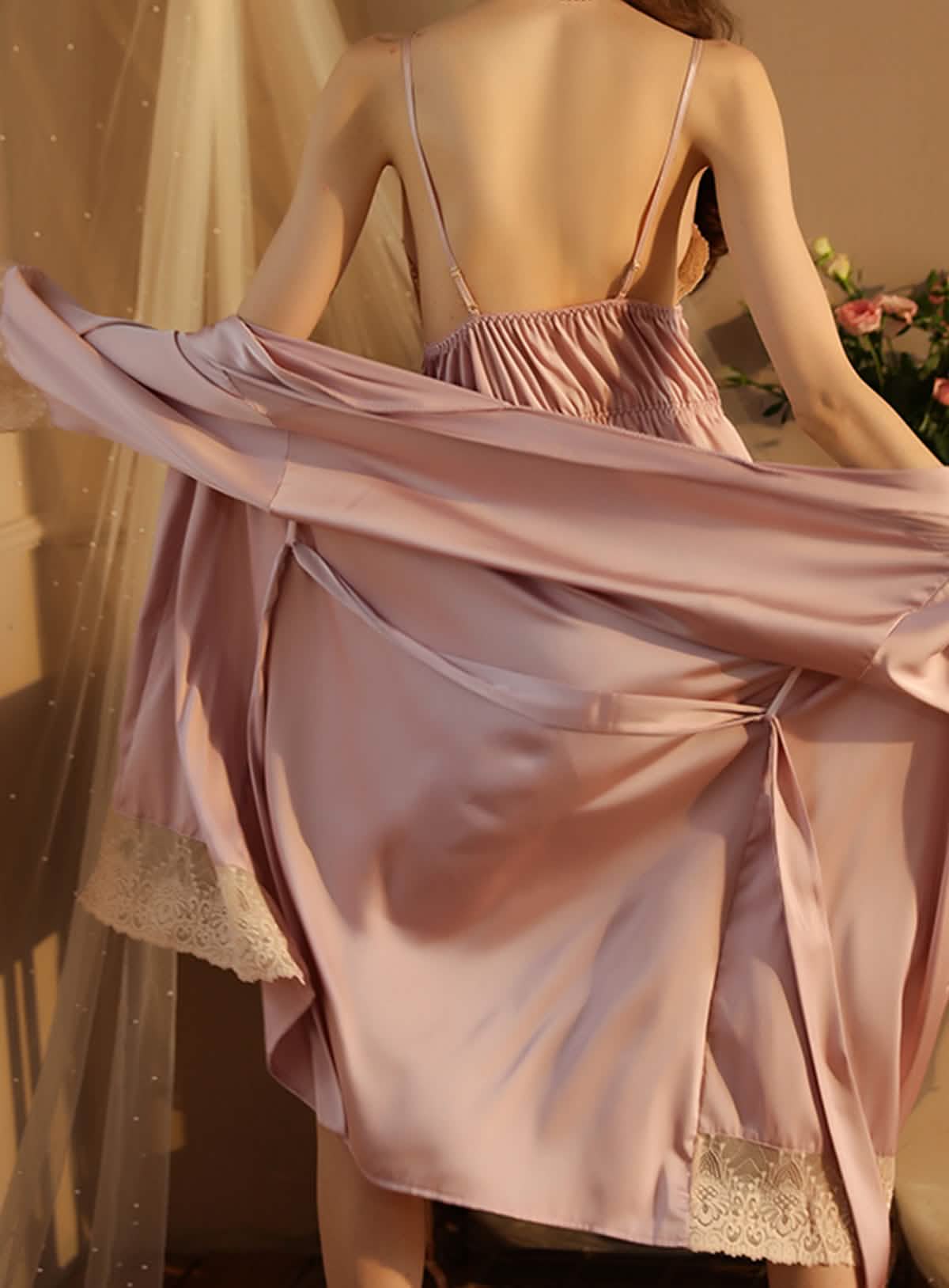 Satin Lace Embroidery Nightgown Robe Dress Set