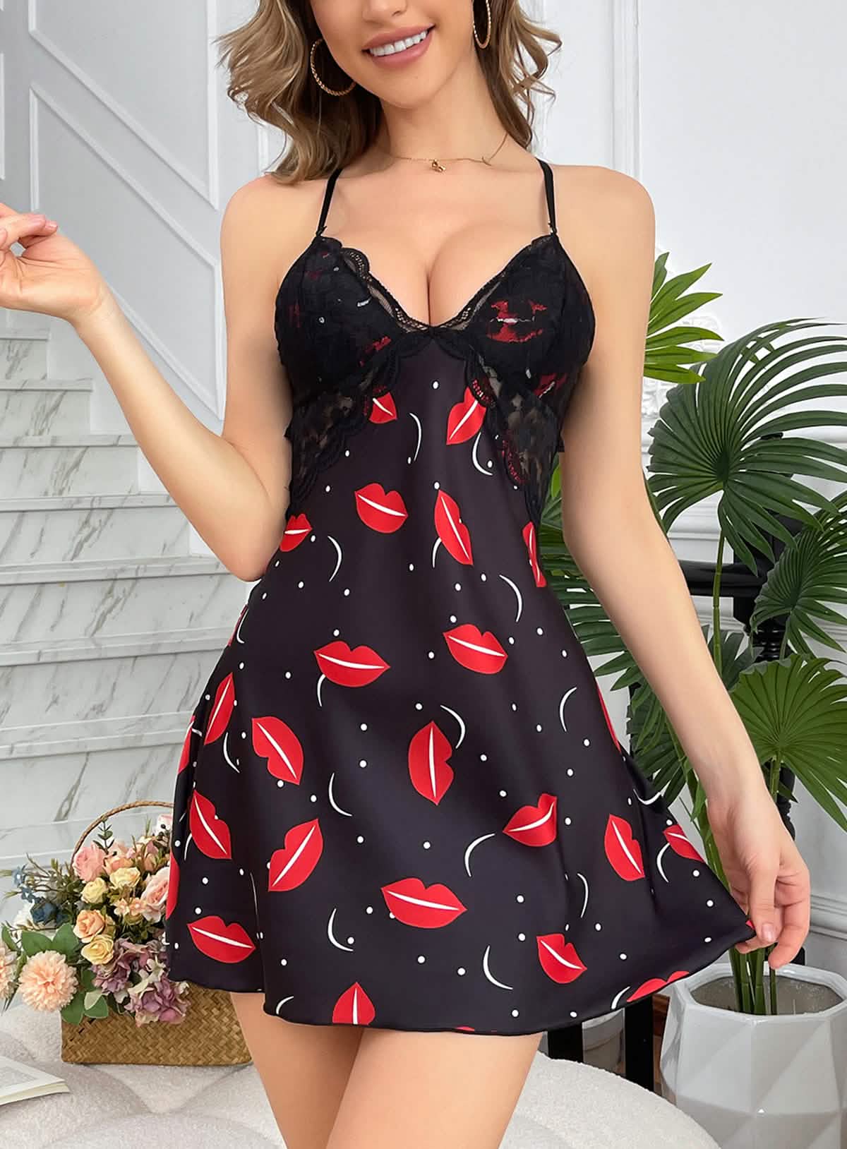 Luna Kiss Satin Nightdress with Red Lip Print & Lace �Sexy Spaghetti Strap Lingerie