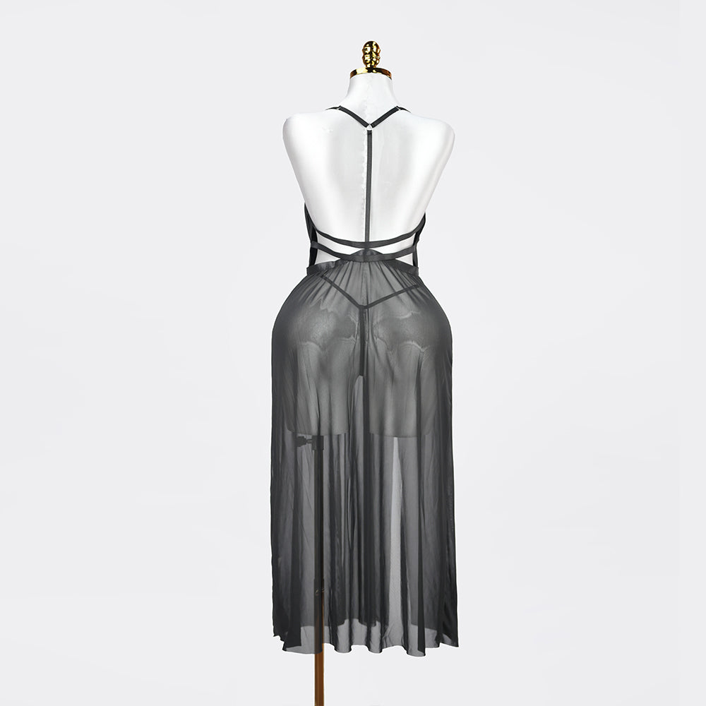 Black plus size nightdress. Crafted from sheer mesh with a thigh-high slit, it creates a mysterious and figure-skimming silhouette for a truly sensual statement.