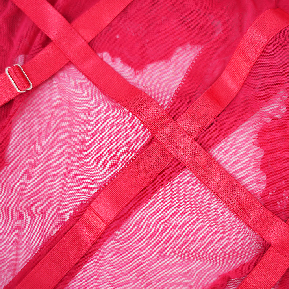 Plus size red mesh bodysuit. Delicate floral embroidery and intricate lace adorn the semi-sheer fabric, crafting a fiery and sensual silhouette.