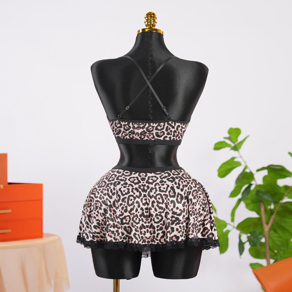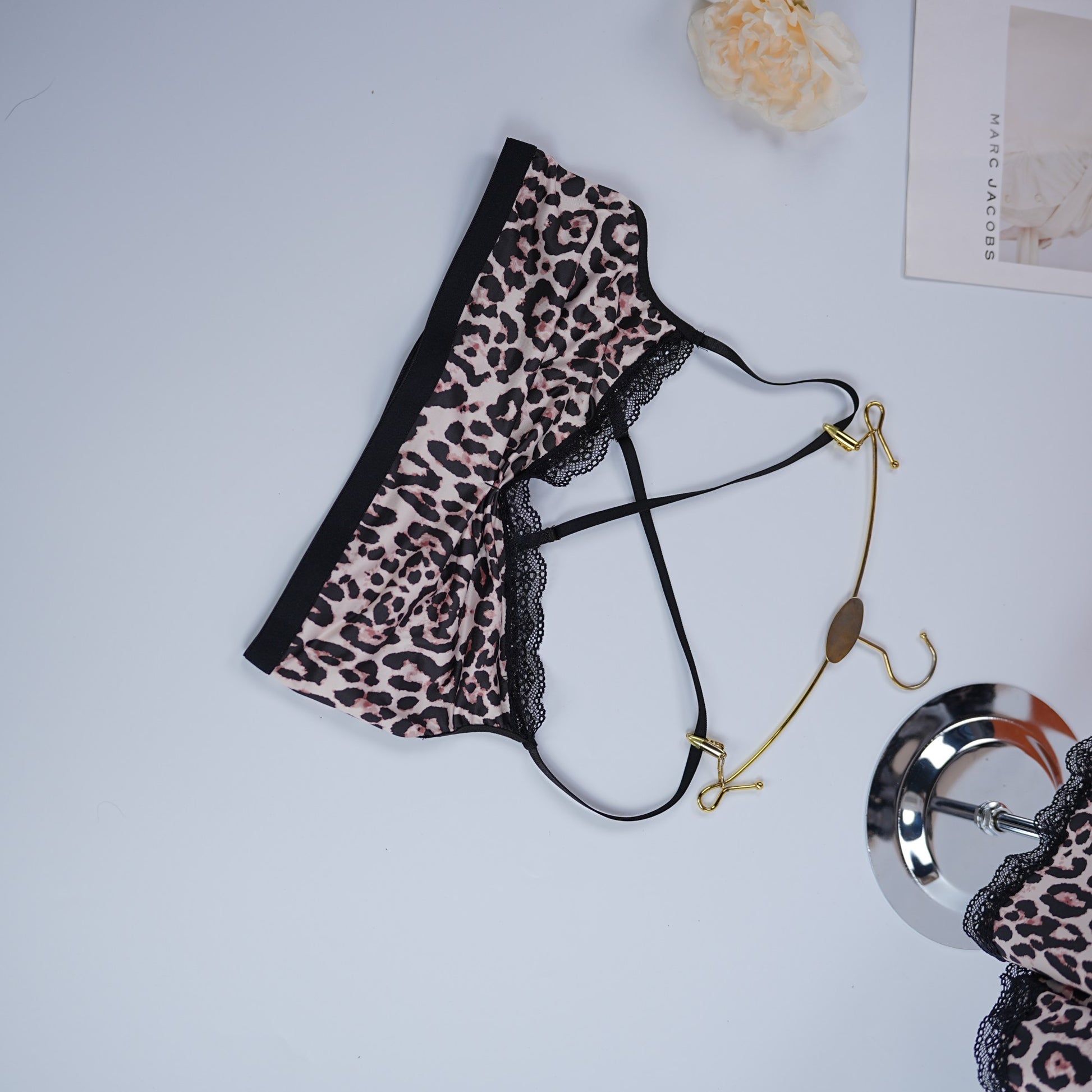 Sexy Wild Leopard Print Bra Panty Set. Features a leopard print pattern paired with exquisite black lace trim, creating a striking blend of untamed allure and refined sensuality.