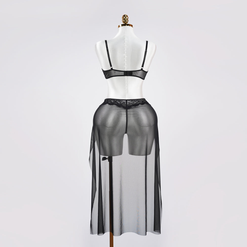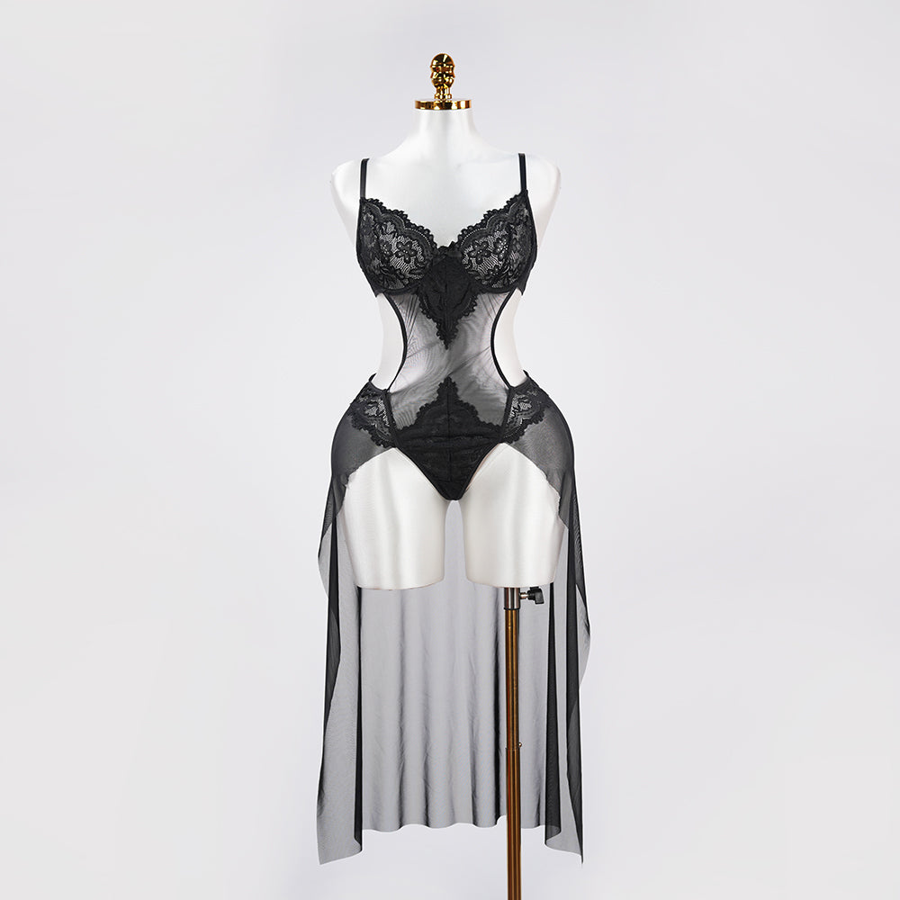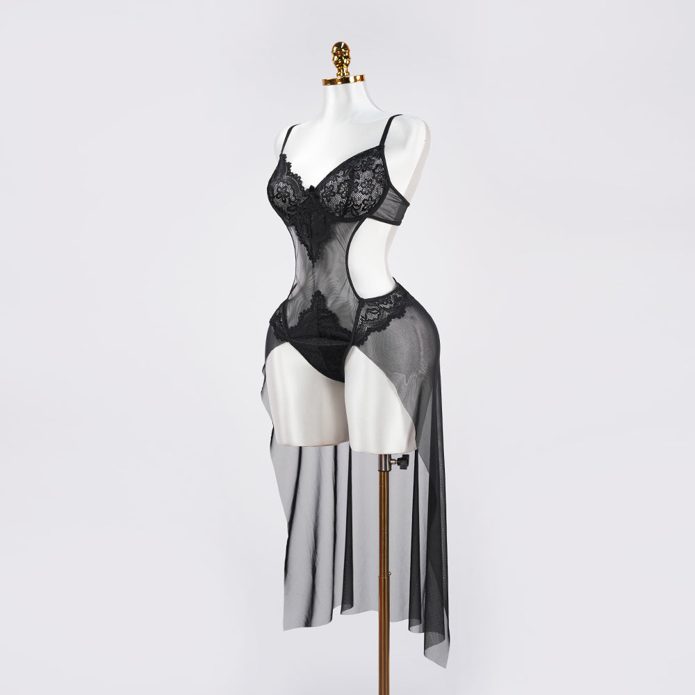 Delicate lace paired with sheer mesh creates a sculpting, curve‑enhancing fit, while the flowing skirt adds a touch of refined sensuality.