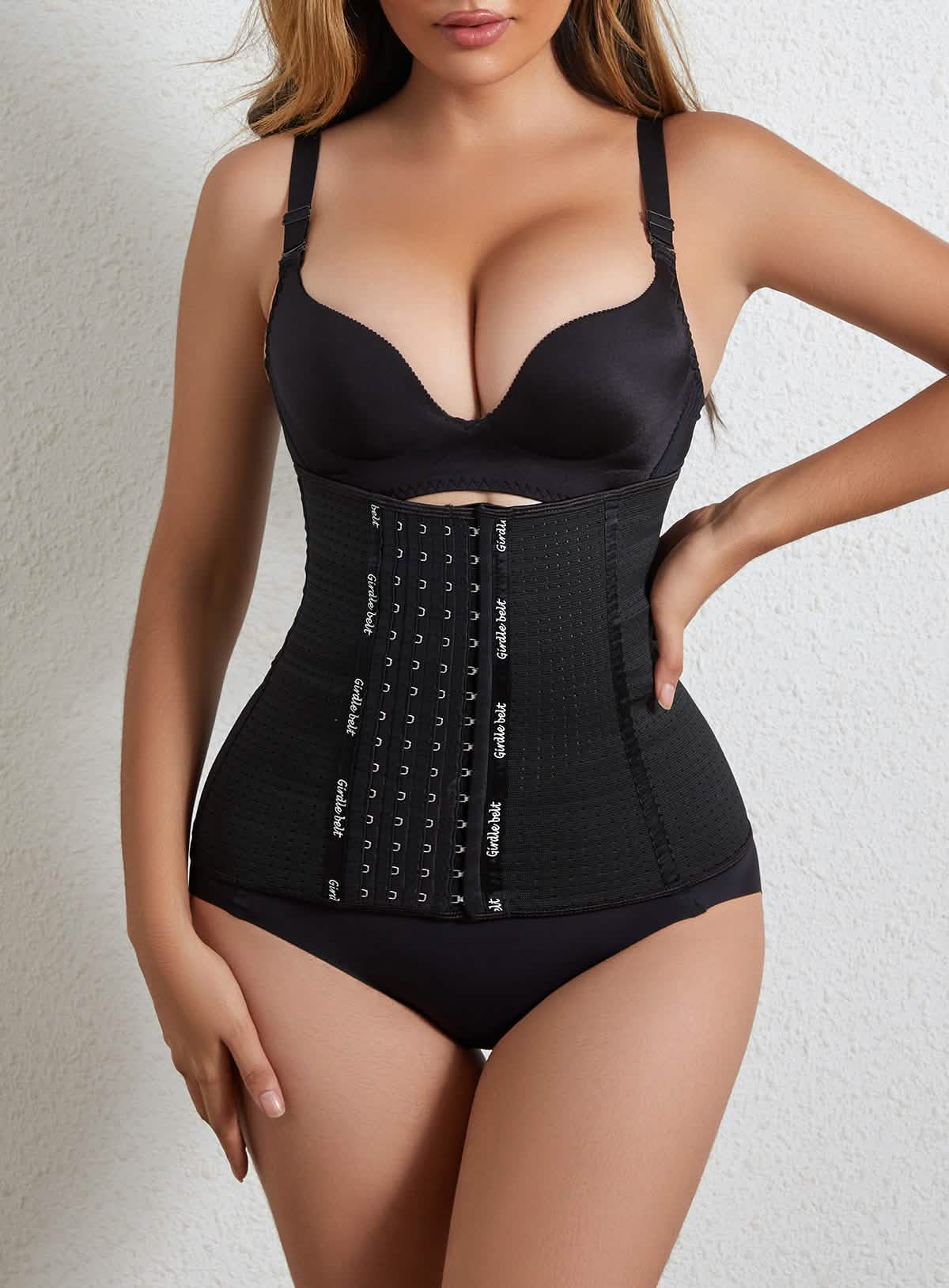 • Multi-Row Hook Closure: Extends from underbust to abdomen with staggered hook-and-eye closures, allowing customizable compression levels for targeted shaping.