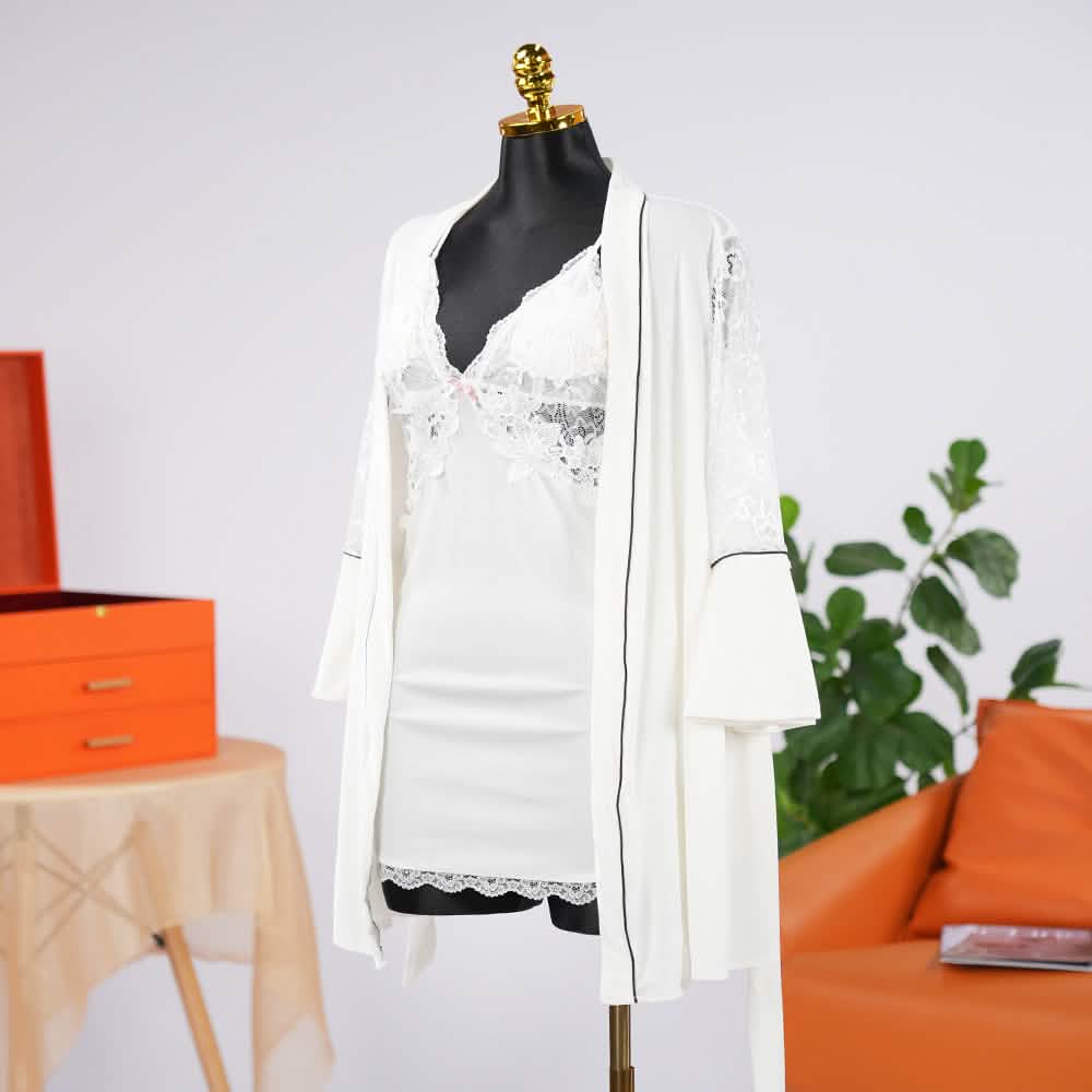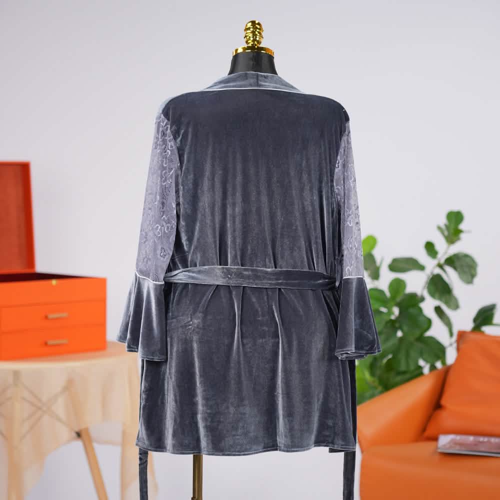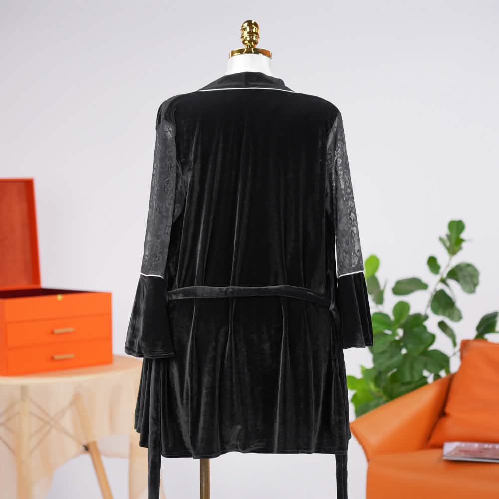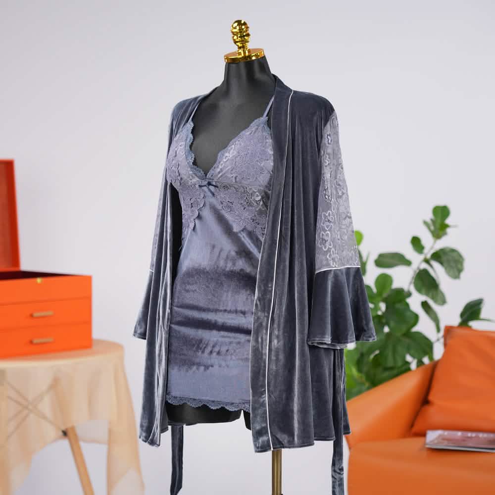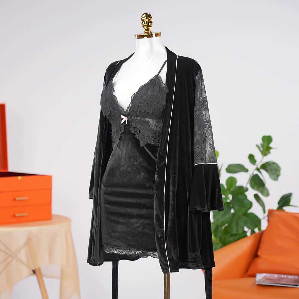 Crafted from premium velvet fabric, offering a smooth, lustrous finish reminiscent of a starlit night. Featuring delicate lace detailing along the neckline and hem, and enhanced by thin straps, the design gracefully accentuates the collarbone and silhouette with an understated allure.