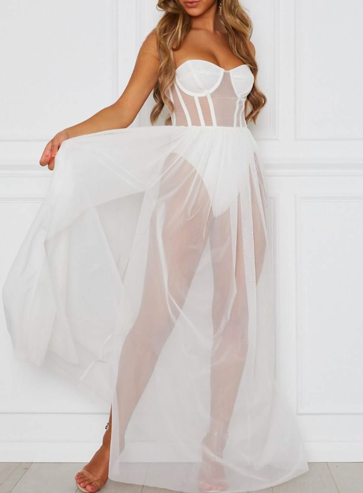 Premium Sheer Fabric: Crafted from high-quality, lightweight sheer fabric, this dress gracefully drapes over the body, revealing a delicate, refined texture.